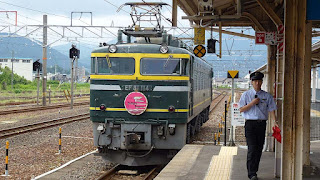 Twilight Express runs by an electric locomotive in Honshu. It runs through rice and wheat fields in Japan Sea side of Honshu. Honshu is the largest island in Japan.